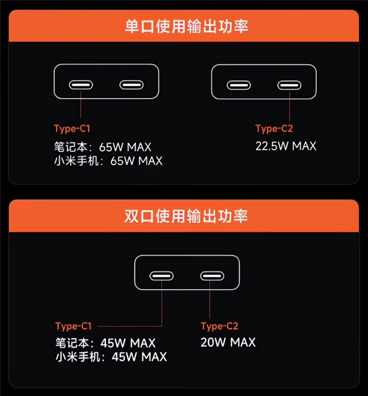 具体功率方面,Type-C1接口最高支持笔记本/小米手机65W快充,Type-C2接口最高支持22.5W快充。