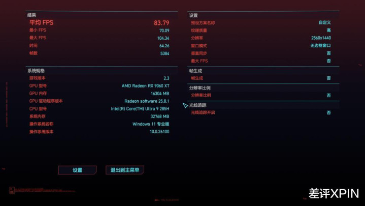 有了显卡坞,GTi15 Ultra 游戏的表现可以说是鸟枪换炮了。实测赛博朋克 2077,2K 高画质并 100% 渲染,平均帧就高达 83 帧,可以说毫无压力。