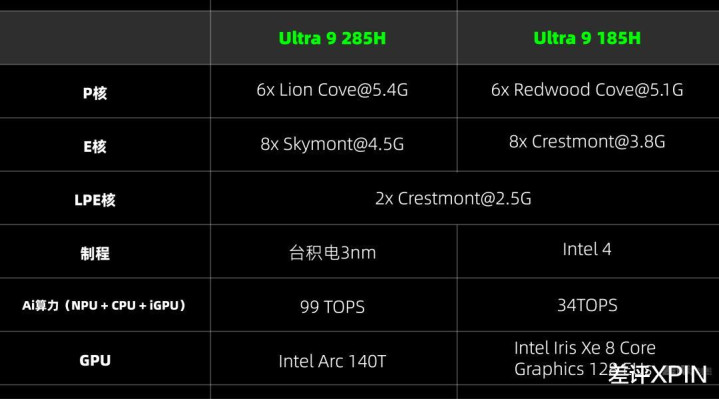 先来说说 GTi15 Ultra 上最大的升级:Ultra 9 285H 处理器。对比上一代 185H,核心架构、制程工艺、Ai 算力等方面均有提升。托尼列了一张表给大家看看区别。