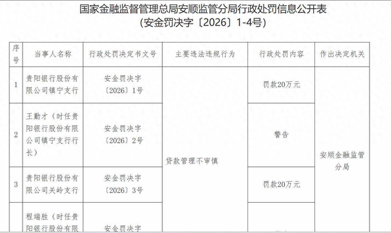 1月8日,国家金融监督管理总局安顺监管分局行政处罚信息公开表显示,因贷款管理不审慎,贵阳银行股份有限公司镇宁支行被罚款20万元,贵阳银行股份有限公司关岭支行被罚款20万元配资官方网站,相关责任人被警告。